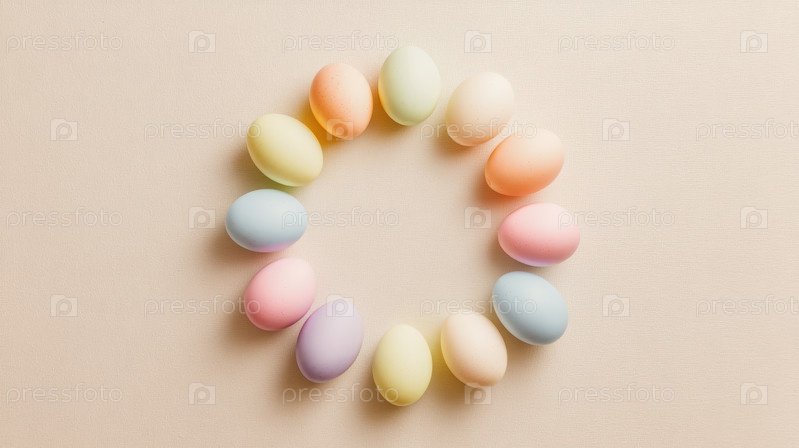 Пастельные пасхальные яйца, расположенные в круглых плоских слоях, мягкие цвета, сезонный праздничный декор, минимальная композиция и яркая концепция весеннего торжества