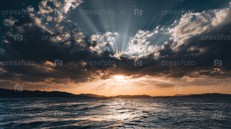 Драматический закат океана с солнечными лучами, пробивающимися сквозь облака, мирный морской пейзаж, сияющий горизонт, природный ландшафт и спокойная прибрежная атмосфера