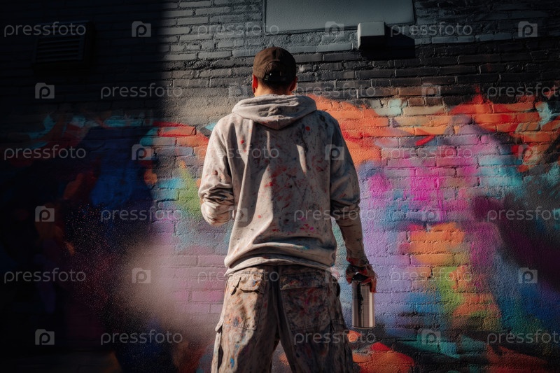 Уличный художник рисует красочные граффити на городской стене, демонстрируя творческое выражение, современную культуру и яркую художественную сцену города