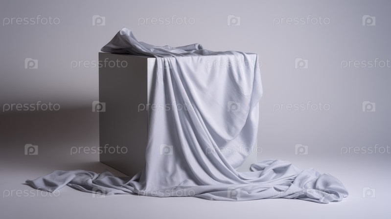 Минимальная установка студии с мягкой тканью, покрытой геометрическим кубом, элегантные текстильные складки создают чистую современную композицию для демонстрации продукта и дизайнерского вдохновения