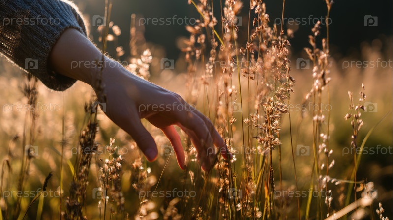 Рука касается подсолнушной травы на поле золотого часа, захватывая спокойную природу, осознанность, образ жизни в открытом воздухе и мирную атмосферу оздоровления