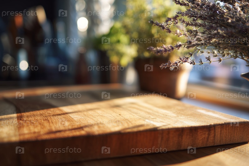 Рустическая деревянная режущая доска на кухонном столе под теплым солнечным светом, идеально подходит для приготовления пищи, приготовления продуктов питания и уютного домашнего контента