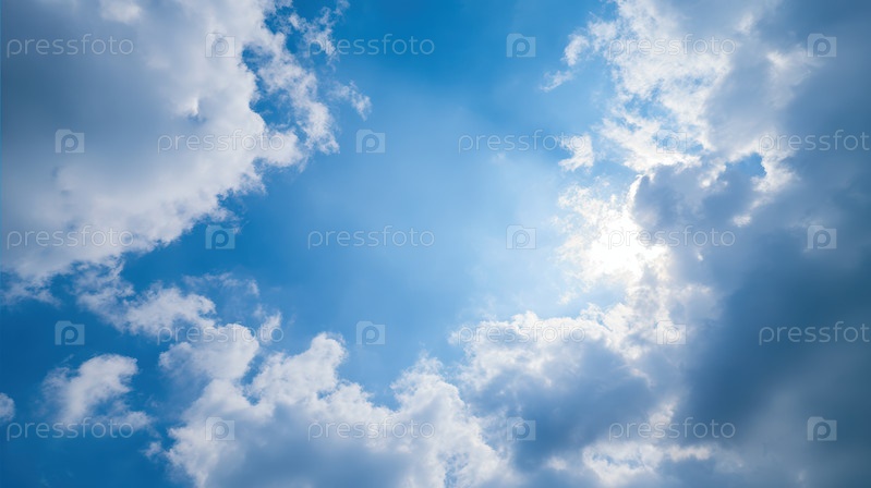 Ярко-синее небо с мягкими белыми облаками и солнечным светом, иллюстрируя мирную природу, атмосферу погоды и концепцию чистого фона