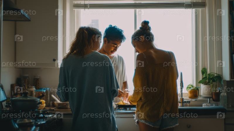 Молодые друзья готовят вместе в уютной кухне, сцена с естественным светом показывает командную работу, моменты образа жизни и случайное домашнее взаимодействие