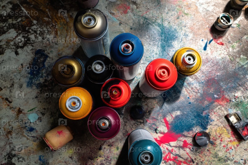 Цветные банки для распыливания краски на беспорядочной поверхности, демонстрирующие инструменты граффити, городское творчество и художественное рабочее пространство с яркими пигментами