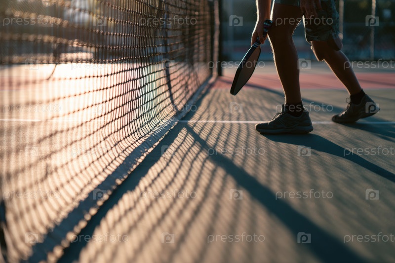 Спортсмен держит ракетку для падель-тенниса возле сетки на закат, представляя вид спорта в открытом воздухе, тренировки, фитнес-образ жизни и динамичное движение