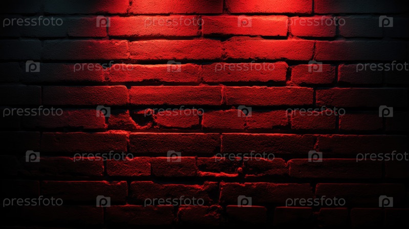 Красное неоновое освещение просвечивает темную текстуру кирпичной стены, создавая драматический городской фон с грандж-эстетикой и кинематографической атмосферой
