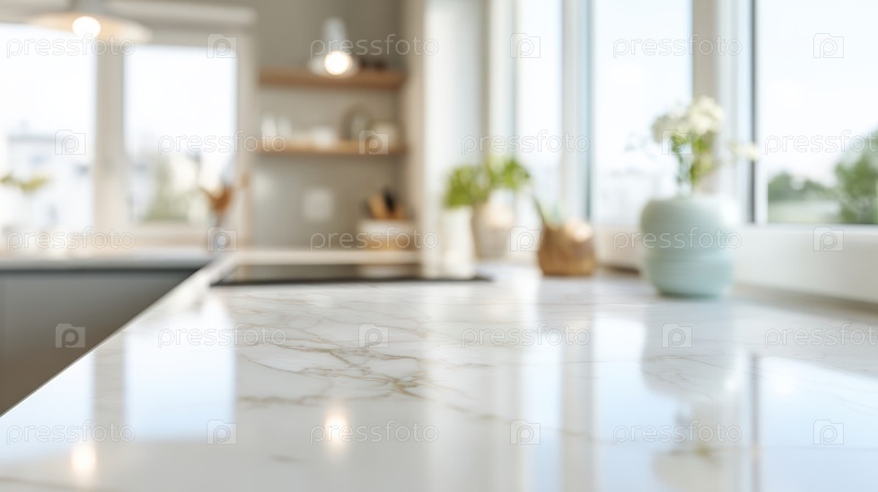 Яркая современная кухня с мраморной столешницей, мягким солнечным светом и минимальным декором создает чистый роскошный интерьер, домашний образ жизни и элегантное вдохновение дизайна