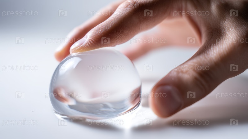Макро-выстрел по уходу за кожей ручной прессой прозрачного гелевого шара, подчеркивая гидратацию, текстуру, красоту и современные косметические инновации