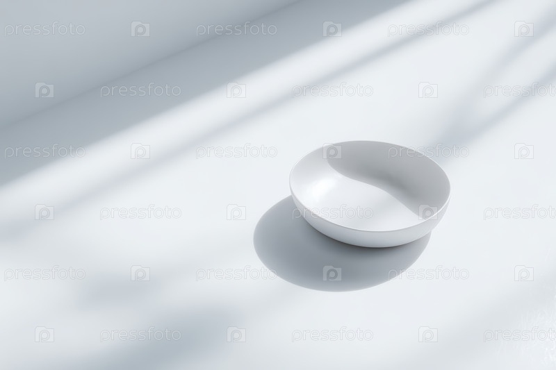 Минимальная белая керамическая чаша на чистом столе, мягкие тени, современная эстетика, простая композиция и элегантный фон студийного продукта