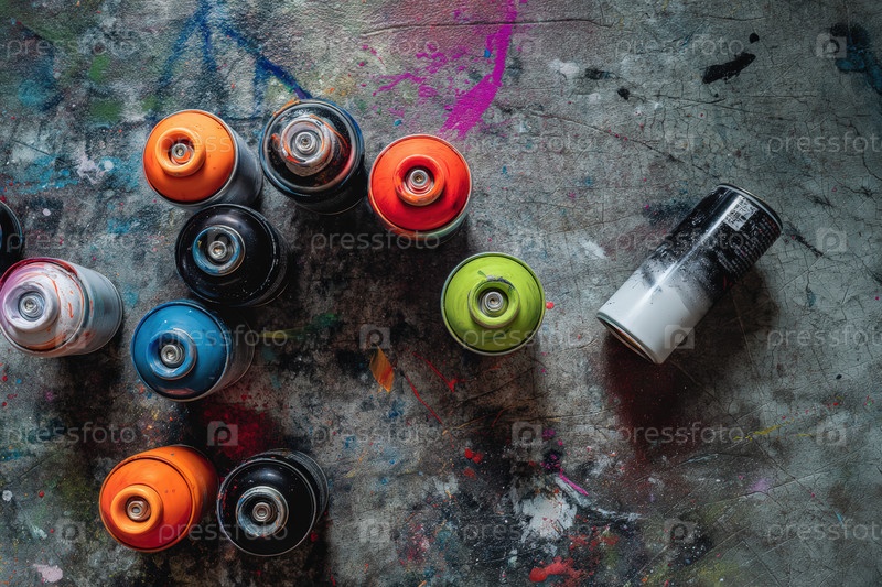 Плоский слой граффити, сделанный из банок для распыливания краски на текстурированной поверхности, представляющих городское искусство, творчество и колоритную уличную культуру рабочего пространства