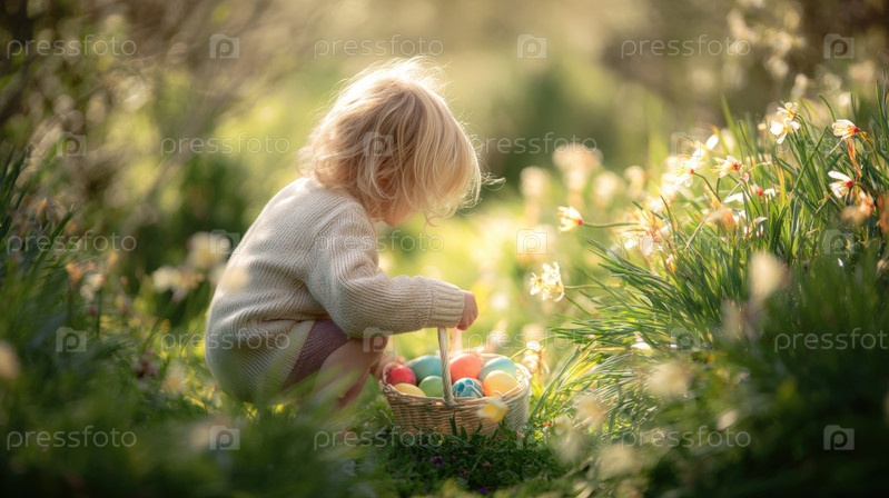 Маленький ребенок собирает красочные пасхальные яйца на солнечном лугу, захватывая детскую радость, игру на свежем воздухе и весенний семейный образ жизни