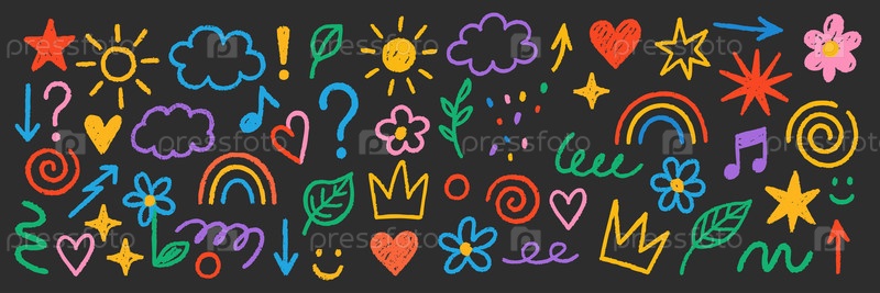 Ручное сердце цветок для ребенка кредом карандаш и векторная икона ребенок. дети школьное облако на лето милые руки и цветные линии мультфильм. иллюстрация ручной краски для детского радужного сердца и мелом нарисованной природы