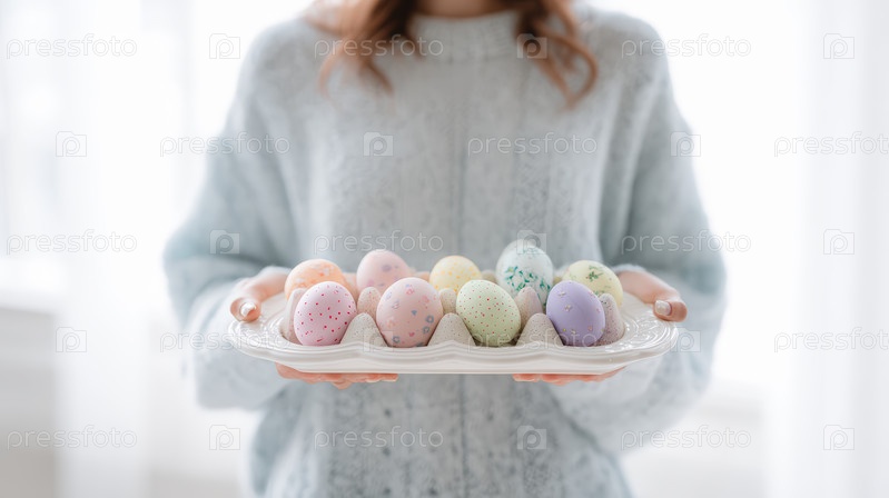 Женщина держит поднос с пастельными пасхальными яйцами, уютный свитер, мягкое освещение, сезонное празднование, чистая минимальная композиция и праздничный весенний домашний декор