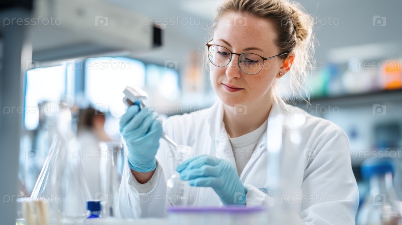 Ученая-женщина проводит лабораторный эксперимент с пипетой и стеклянной посудой, демонстрируя исследования, здравоохранение и научные инновации