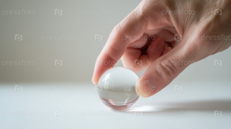 Рука держит прозрачную гелевую сферу на чистом фоне, показывающую минимальный абстрактный объект, мягкую текстуру, эластичность материала и современную концепцию дизайна продукта