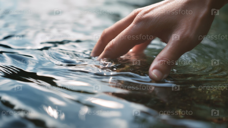 Рука касается морщинистой поверхности воды, мягкое движение, естественное отражение, успокаивающая текстура, сенсорное взаимодействие и мирный момент на свежем воздухе