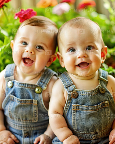 Два счастливых малыша в джинсовых прыжках, улыбающиеся в саду