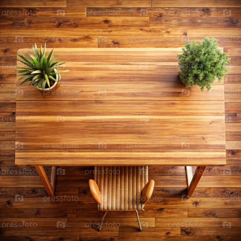 Вид на деревянный стол со стулом и растениями на полу из твердой древесины