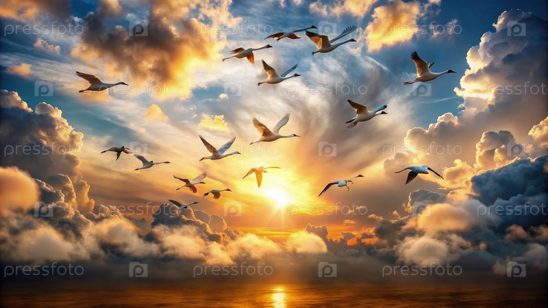 Птицы, летящие в облаках восхода солнца