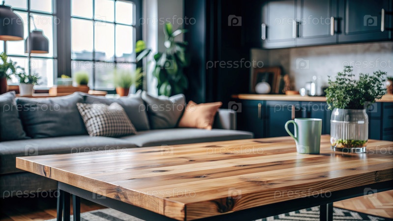 Уютная гостиная с деревянным столом и мягкими подушками для отдыха в современном интерьере