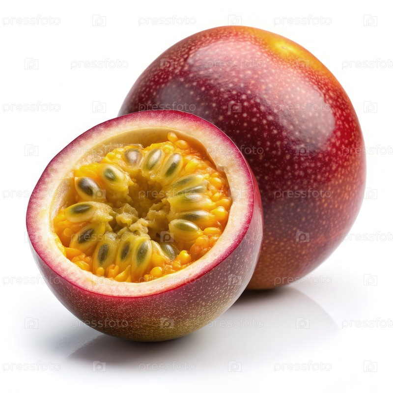 Свежерезанный плод страсти раскрывает сочный интерьер на ярко-белом фоне