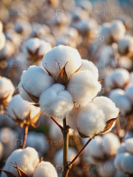 Ближайшее изображение хлопковых шариков на растении в поле при закате солнца