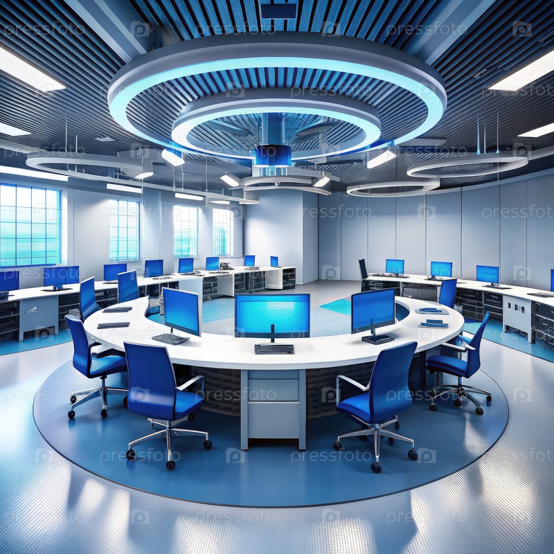 Современная лаборатория искусственного интеллекта с циркулярными рабочими станциями. генеративный ИИ