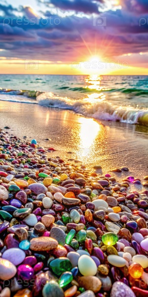 Завораживающий пляжный закат с красочными камнями вдоль береговой линии и мягкими волнами