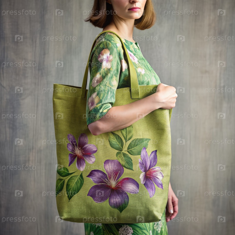 Модный покупатель в зеленой льняной ткани демонстрирует цветочный пакет с тортом, наслаждаясь солнечным днем на свежем воздухе