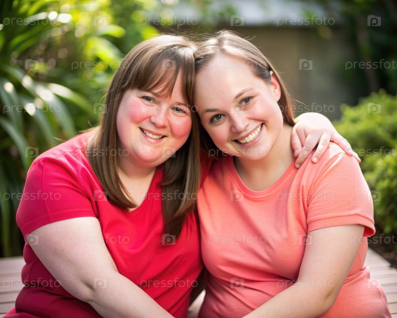 Две женщины в красной и коралловой рубашках, улыбающиеся вместе на открытом воздухе