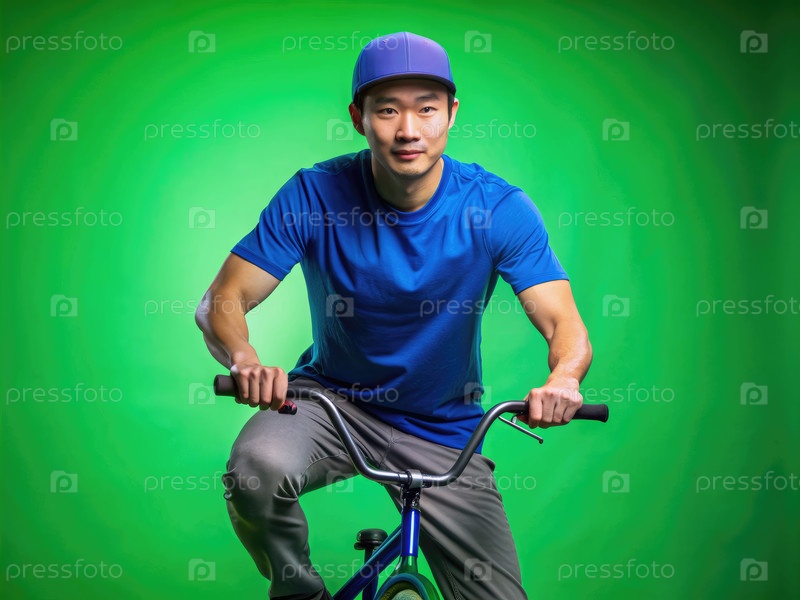 Красивый азиатский мужчина едет на велосипеде на зеленом фоне