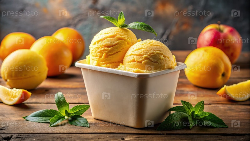 Две ложки мангового мороженого подают в белой ванне на деревянном столе со свежими листьями мяты