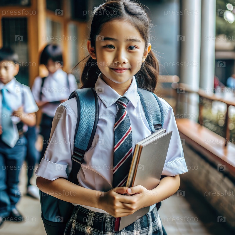 Школьная девочка в форме держит книги на школьном коридоре