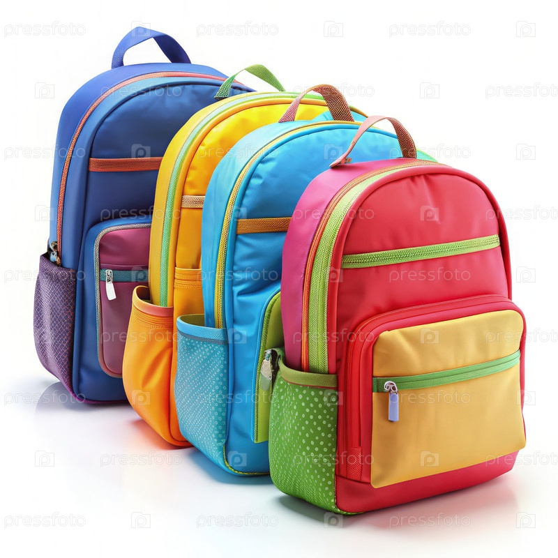 Цветные школьные рюкзаки расположены в ряд на белом фоне