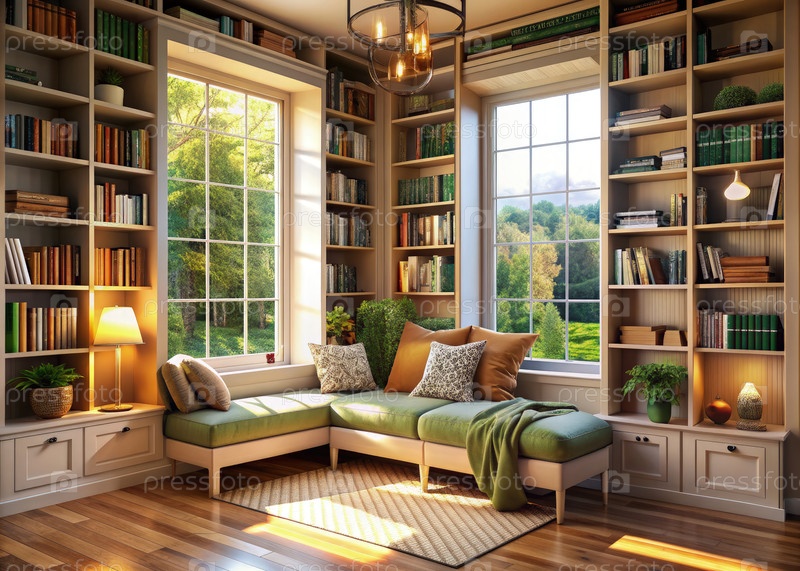 Уютное читальное пространство, предназначенное для комфорта с естественным светом и зеленью. генеративный ИИ