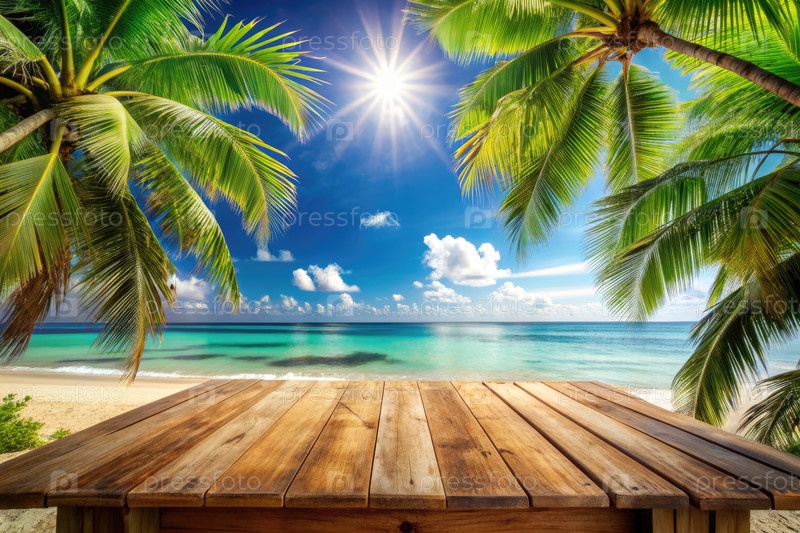 Тропический пляжный деревянный стол с пальмами и солнечным небом