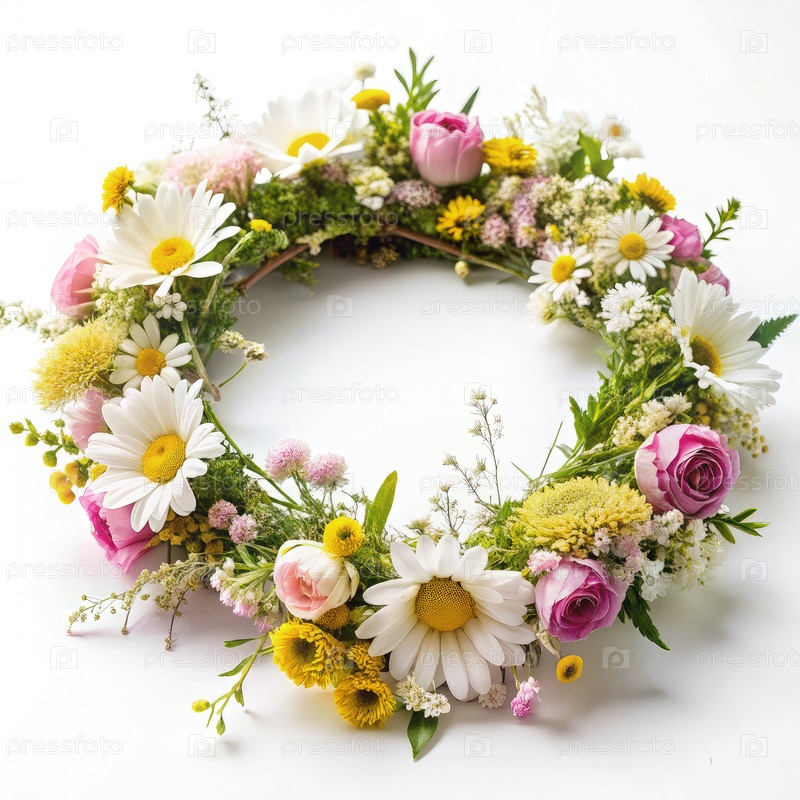 Рустический цветочный венок с розовыми и желтыми цветами на белом фоне