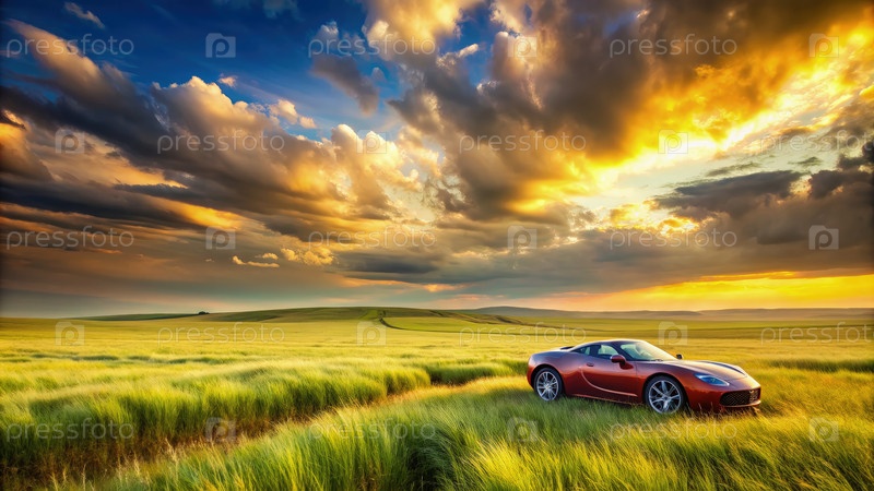 Красный спортивный автомобиль, припаркованный на поле травы во время красочного заката