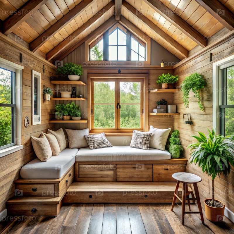 Уютный деревенский интерьер крошечного дома с безмятежным естественным светом и удобной посадочной зоной