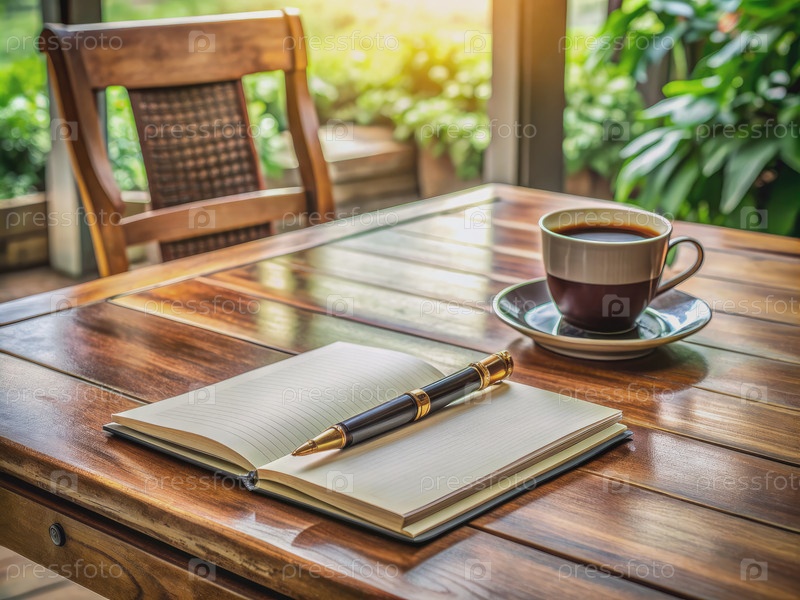 Деревянный стол с блокнотом, ручкой и чашкой кофе на полуденном солнечном свете