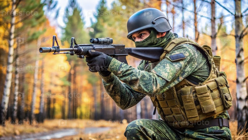 Русский солдат стреляет из винтовки в Осеннем лесу