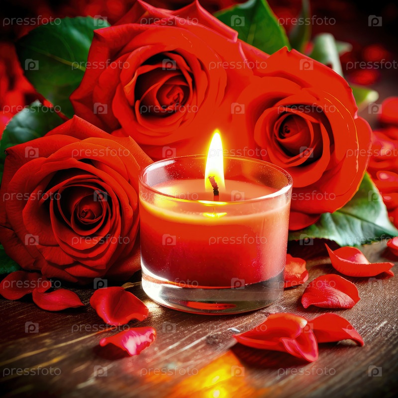Ароматная свеча и розы на деревянном столе