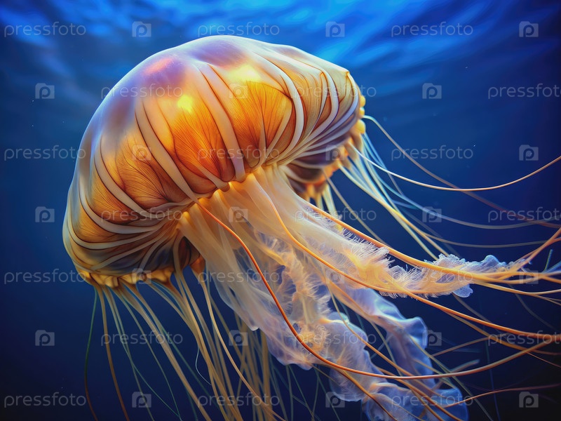 Близкий взгляд на большую оранжевую медузу, дрейфующую в океане