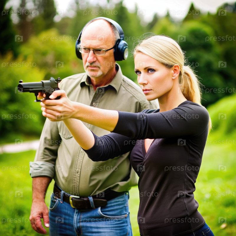 Женщина практикует стрельбу с инструктором на открытом поле