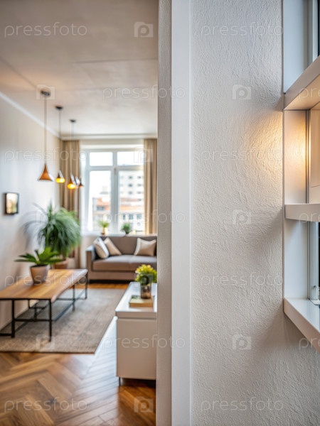 Вид на современный уголок квартиры с белыми стенами и деревянными полами