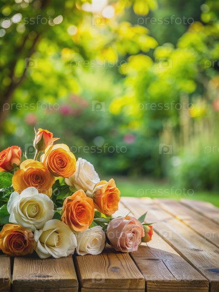 Букет роз, отдыхающих на деревянном столе в роскошном саду