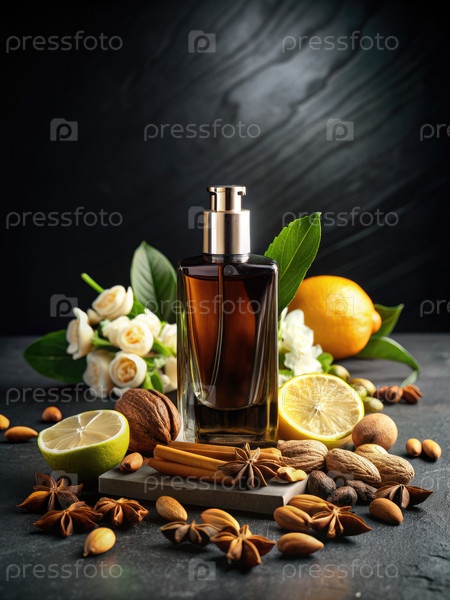 Бутылка парфюмерии на черном подиуме с натуральными ингредиентами