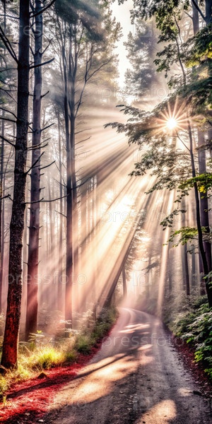 Солнечные лучи проникают по туманной лесной тропе в летнее утро