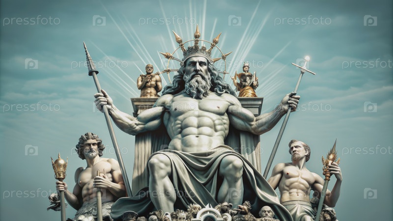 Мощная скульптура, изображающая мускулистую фигуру, сидящую на троне с короной и окруженную другими статуями